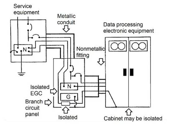 隔離 EGC 從隔離接地型插座(為電子設備供電)通過導管直接連接到隔離變壓器的中性點到接地點。EGC 可以穿過子面板,而不連接到設備金屬框架接地總線。將攜帶隔離 EGC 的金屬導管連接到兩端的外殼。NEC 要求源自次級繞組的所有電線(相線、中性線、隔離 EGC 線以及使用時的綠線)都在同一導管中運行。
