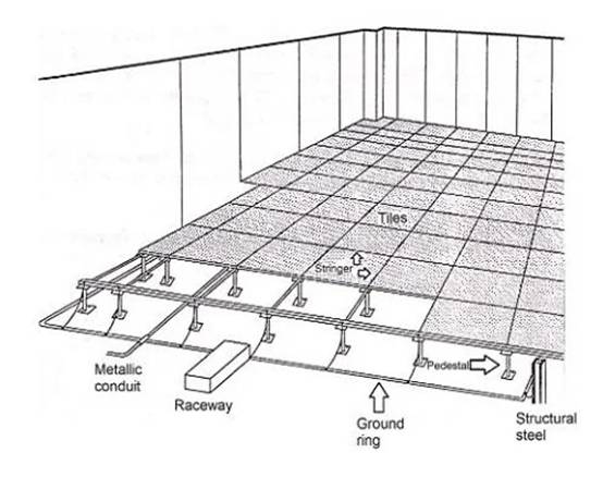 高架地板由金屬基座支撐的金屬縱梁網格組成。地磚是落入縱梁的特定地板的一部分。瓷磚的頂部是低導電率材料,為直接放置在其上的設備柜提供隔離,但允許釋放人員產生的靜電。瓷磚的底部是銅網格,與支撐結構接觸良好。金屬縱梁粘合在一起,形成接地層。