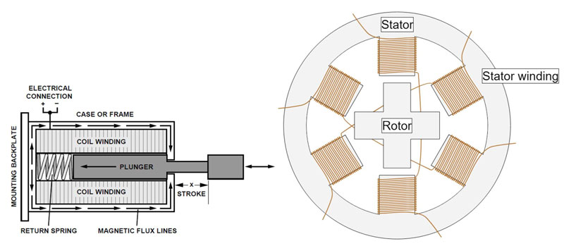圖 1:螺線管的結構包括帶內部滑動柱塞的繞接線圈(左圖);步進電機則更為復雜,轉子上有永磁體,定子上有電磁線圈(右圖)。(圖片來源:Analog Devices、Monolithic Power Systems)