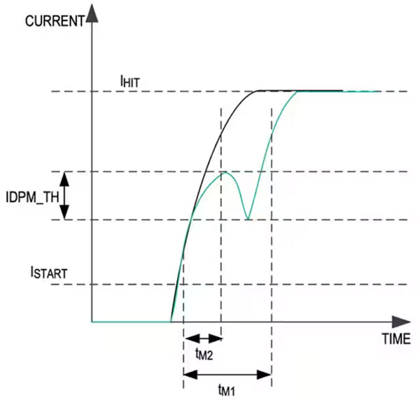 前四項是眾所周知的標準功能。DPM 則需要進一步解釋。舉例而言,在螺線管控制的閥門中,如果螺線管啟動時閥門工作正常,則電流分布不是單調的(圖 3,黑色曲線)。相反,受柱塞運動產生的反向電動勢 (BEMF) 影響,電流會出現下降(圖 3,藍色曲線)。