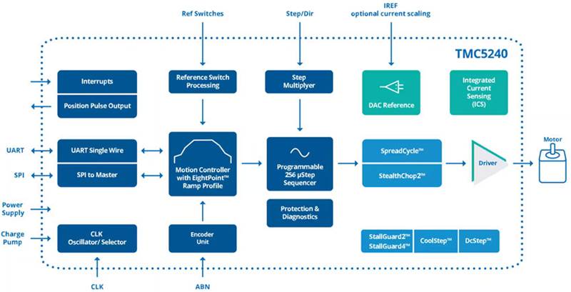 步進電機比螺線管更復雜,控制要求更高。這從 Analog Devices 的 TMC5240(圖 5)中可見一斑,其是一款集成的高性能步進電機控制器和驅動器 IC,具有串行通信接口(SPI、UART)和豐富的診斷功能,并提供嵌入式算法。