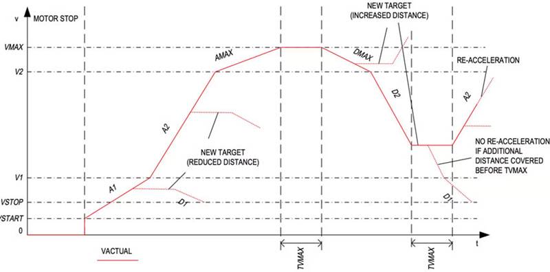 例如,三個加減速段的組合可以有兩種用途:在較低速度下使用較高加速度值以適應電機扭矩曲線,或者在從一個加速段過渡到下一個時減少急動。針對這兩類情況,TMC5240 控制器憑借八點運動曲線生成器,可在所需目標位置實時變化的同時保持恒定速度段,從而實現順暢的模式轉換(圖 6)。