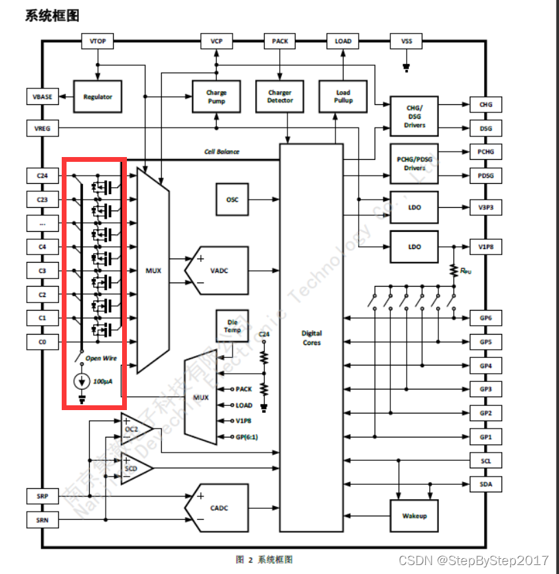DVC1124在C1~C24電池采樣引腳上集成了24個(gè)100μA下拉電流源,在開啟電池采樣斷線檢測功能時(shí),24個(gè)電流源會同時(shí)下拉,MCU可以根據(jù)電池電壓測量值判斷在電池采樣引腳上是否存在斷線。斷線檢測功能的定時(shí)器時(shí)間為1s,倒計(jì)時(shí)結(jié)束后,芯片會自動關(guān)閉所有下拉電流源。