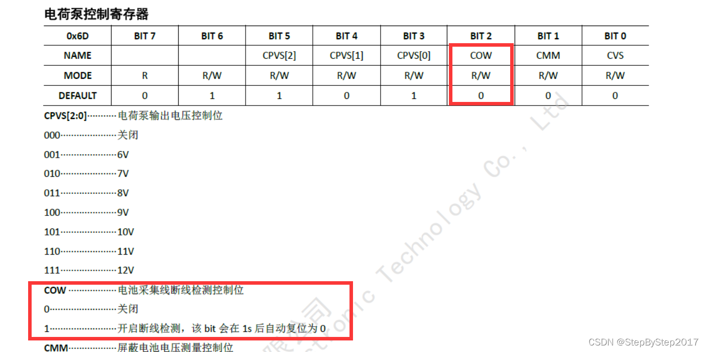 1.使能電荷泵控制寄存器COW位(電池采集線斷線檢測控制位)
