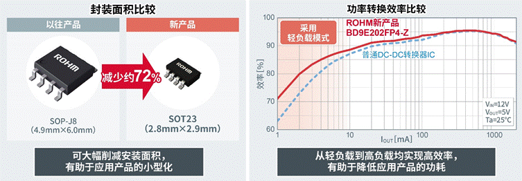 近年來,在消費(fèi)電子和工業(yè)設(shè)備應(yīng)用領(lǐng)域,隨著產(chǎn)品功能的增加,對節(jié)省電路板空間的要求越來越嚴(yán)格,小型DC-DC轉(zhuǎn)換器IC的使用率也與日俱增。另外,降低待機(jī)功耗已成為亟需解決的一大課題,這就要求DC-DC轉(zhuǎn)換器IC在低功率(輕負(fù)載)時實(shí)現(xiàn)更高效率。為了滿足這些市場需求,ROHM開發(fā)出比現(xiàn)有SOP-J8封裝產(chǎn)品更小、效率更高的產(chǎn)品。