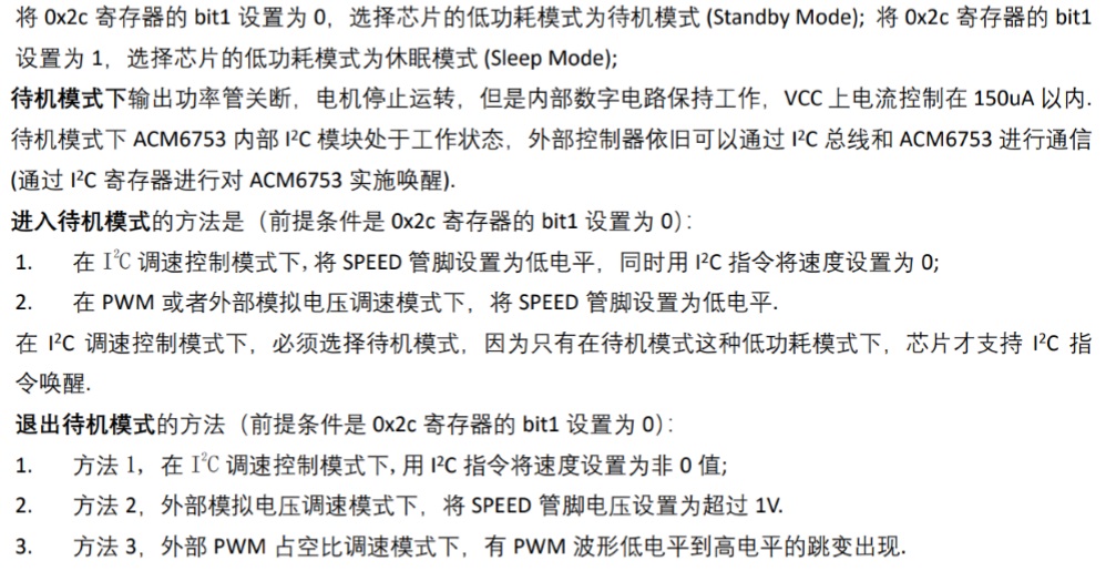 如果對功耗不是追求極致,可以接受150uA的待機電流,可以用待機模式,建議“SPEED管腳下拉到地”, 所有調速/方向控制/剎車控制都由I2C控制.
