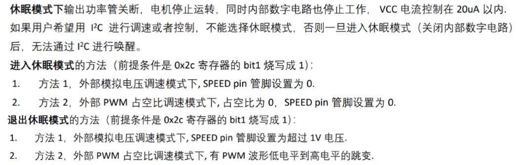 3) 下一次退出休眠模式. Speed管腳 (pin5)重新設置為高電平→300ms以內用I2C命令將速度設置 為0(通過0x01和0x02寄存器)→然后初始化其他電機運轉參數相關寄存器,同時將0x2c寄存 器的bit1設置為1→設置目標轉速以及正反轉/剎車等;