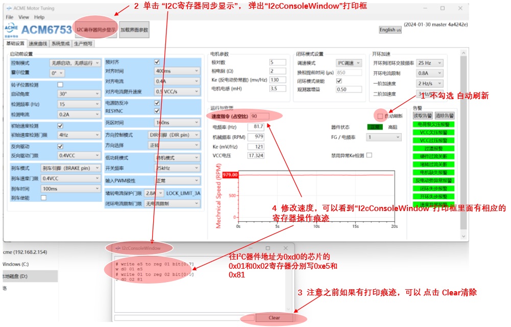 ACM6753上電默認是外部SPEED管腳模擬電壓調速模式,當SPEED管腳(pin 5)外部電壓不為零時,上電后 ACM6753檢測到該管腳電壓為非零值就會認為收到調速指令,但是此時電機參數還沒有通過I2C指令配置進來,必 然會產生失步錯誤,從而停留在這個錯誤報警狀態長達5秒鐘, 造成較長的啟動延時. 因此在使用I2C控制ACM6753 時要么“避免在初始化之前SPEED管腳為非零值(>0.2V)”, 要么“在ACM6753上電后 300ms以內迅速用I2C指令將 速度配置為0,然后開始初始化電機相關參數” .