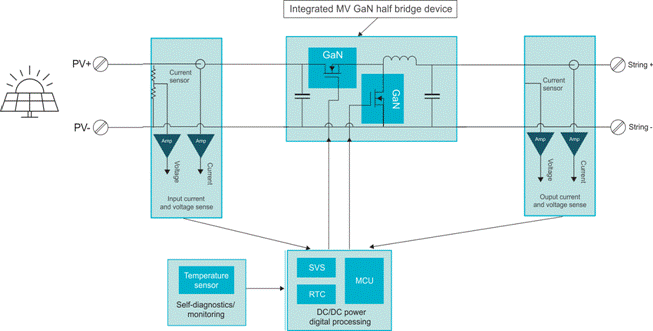 太陽能主要通過太陽能電池板的兩種子系統得以實現:一種是升壓級后跟逆變器級,將直流電壓范圍轉換為交流電壓(如圖 1 所示);另一種是降壓和升壓級,其中電源優化器將不斷變化的直流電壓轉換為常見的直流電壓電平(利用最大功率點跟蹤),以輸送到串式逆變器(如圖 2 所示)。