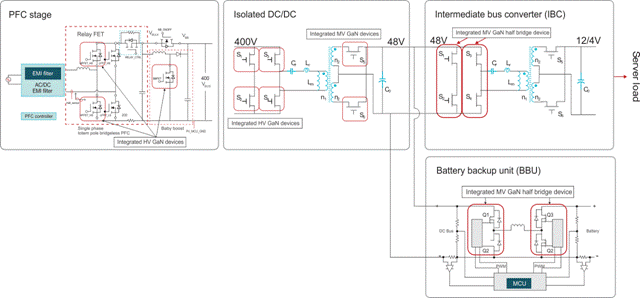 如圖 3 所示,服務器電源應用中的三個主要系統可以采用 100V 至 200V 的 GaN: