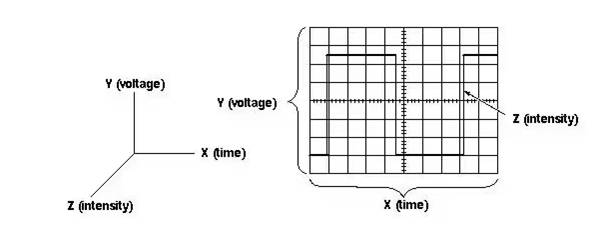 在示波器顯示屏上,橫坐標(X)代表時間,縱坐標(Y)代表電壓,(注,如果示波器有測量電流的功能,縱坐標還代表電流。)還有就是比較少被關注的-亮度(Z),在TEK的DPO示波器中,亮度還表示了出現概率(它用16階灰度來表示出現概率)。