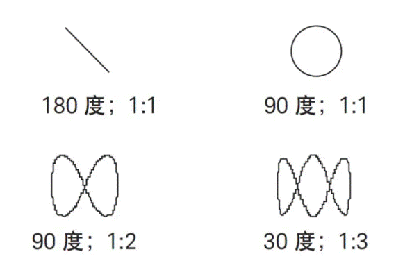 根據 Lissajous 圖的形狀可以得知兩個信號之間的相位差與頻率比。圖顯示了 Lissajous 圖及其代表的相位差/頻率比。