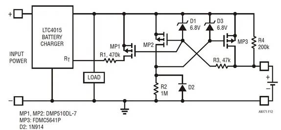 故障狀態可通過人為操控電路 (在 R1 的頂端和電池充電器輸出之間建立臨時連接) 進行演示。然而,普遍認為該電路更傾向于連接。如果連接失敗確實成為一個問題,那么可以設計一款利用多個器件停用電池充電器的電路。圖 12 給出了一個更加完整的電路例子。