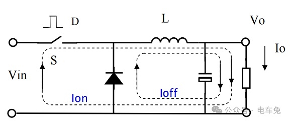 開(kāi)關(guān)導(dǎo)通階段:當(dāng)BUCK轉(zhuǎn)換器的開(kāi)關(guān)元件(通常是MOSFET)導(dǎo)通時(shí),輸入電壓直接施加于電感上,導(dǎo)致電感電流增加,此時(shí)能量存儲(chǔ)于電感的磁場(chǎng)中。
