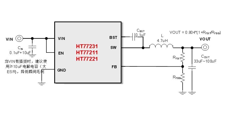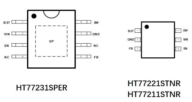 ・3.5A (HT77231) /2A (HT77221) /1.2A (HT77211) 降壓,內置100mΩ和60mΩ功率管