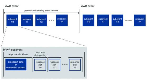 為了解釋其工作原理,我們將使用廣播者和觀察者的命名規則。廣播并不新鮮,數據由廣播者發送,觀察者掃描接收。PAwR 的新穎之處在于,廣播數據是在確定的時間段內以小數據包的形式組織起來的,觀察者可以精確地與之同步并作出響應。數據在 PAwR 事件中發送,而 PAwR 事件由 PAwR 子事件組成。每個觀察者可與一個或多個子事件同步,在同步后,觀察者只在這些特定的時間段內主動接收數據。