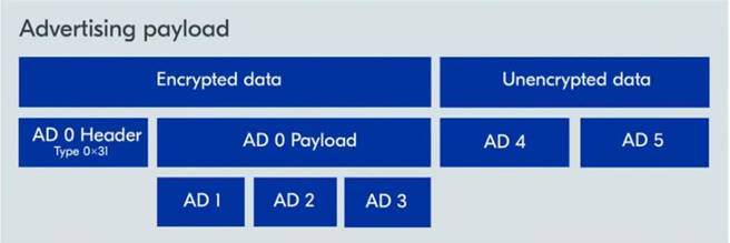 廣播數據 0 封裝 AD 1-3,這些數據是加密的。隨后是 AD 4 和 AD 5,它們是未加密的。這樣就可以靈活地保留一些非關鍵的廣播數據,供任何觀察者解讀,例如 AD 類型 0x01(標志)或 0x09(完整本地名稱)。