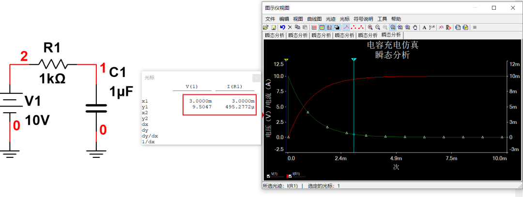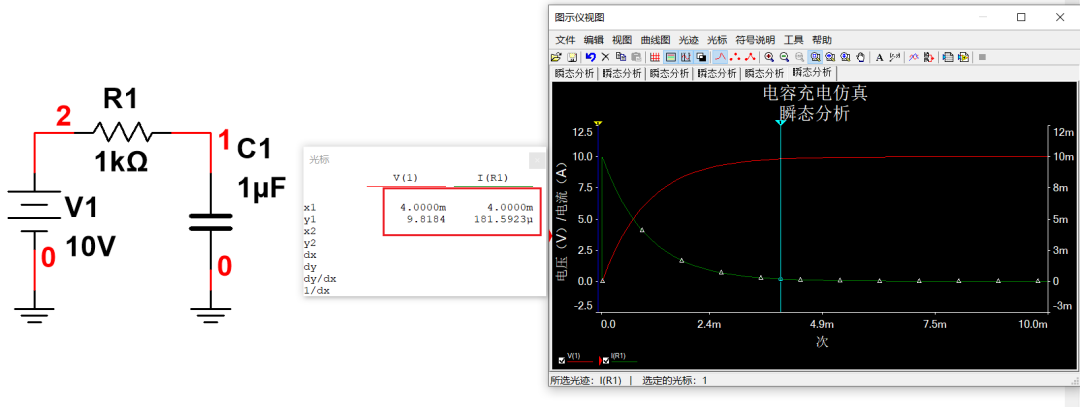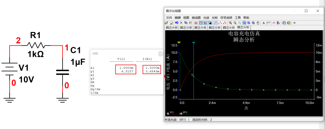 1個時間常數1ms的時間,電容電壓充到63%,前半段電容的充電電流還是很大的,此時反推回去1τ下的充電電流為0.37*V1/R1。綠色的為電容的充電電流曲線,紅色的為電容的充電電壓曲線。
