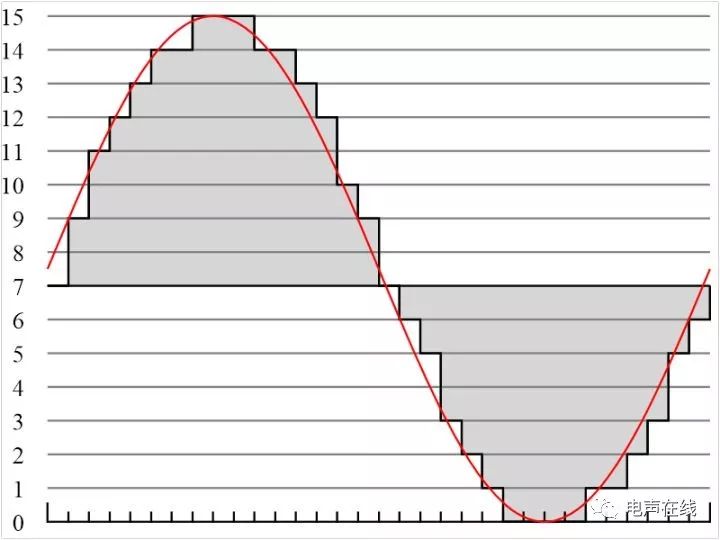 下圖反映了數字電路在采樣過程中呈現的波形,一個臺階可以看作是一次采樣,顯然,這些采樣臺階7越多,就越接近原來的正弦波形。