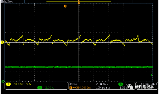 對(duì)于只需要關(guān)心輸出紋波峰峰值大小的應(yīng)用,圖8的結(jié)果已經(jīng)足夠了。但是若想要了解更多紋波的細(xì)節(jié),那么圖8的波形則尚嫌不足。這是因?yàn)槲覀兪褂玫氖浅R?jiàn)的X10倍示波器探頭,真實(shí)的信號(hào)會(huì)先經(jīng)過(guò)1/10分壓進(jìn)入示波器進(jìn)行采樣。在輸入紋波很小,并且經(jīng)過(guò)1/10分壓后,其與示波器的本底噪聲相近,所以圖8的波形上實(shí)際疊加了很多示波器的本底噪聲。