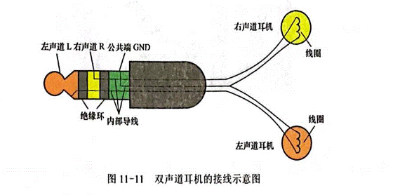 圖11—11所示是雙聲道耳機的接線示意圖,從圖中可以看出,耳機插頭有L、R、公共三個導電節,由兩個絕緣環隔開,三個導電節內部接出三根導線,一根導線引出后一分為二,三根導線變為四根后兩兩與左、右聲道耳機線圈連接。