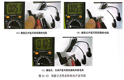 用數字萬用表檢測雙聲道耳機如圖11—13所示,萬用表選擇2k2擋,圖11—13(a)所示是測量左聲道耳機線圈的電阻,顯示電阻值為510(0.051kQ),圖11—13(b)所示是測量右聲道耳機線圈的電阻,顯示電阻值為532,圖11—13(c)所示是測量左、右兩聲道耳機線圈的串聯電阻,顯示電阻值為1032。