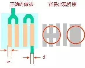 如果相鄰的焊盤需要相連,首先確認在外面進行連接,防止連成一團造成橋接,同時注意此時的銅線的寬度。