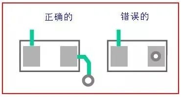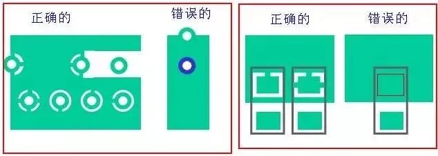 如果采取左邊的方式的話,在焊接或者維修拆卸元器件時比較困難,因為溫度通過敷的銅把溫度全面分散,導致焊不上。