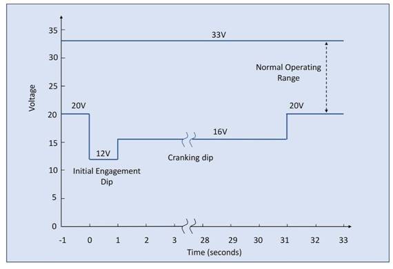 MIL-STD 1275/F 定義了 28VDC 電源的工作范圍,限制為 20V 和 33V,并且在初始“接合”電壓降至 12V 后啟動電壓降至 16V。級別和時間顯示在圖1。