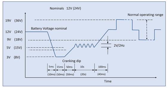 圖2: 軍用車輛直流電源范圍符合 DEF-STAN 61-5,適用于 12V 和(括號內)24V 系統