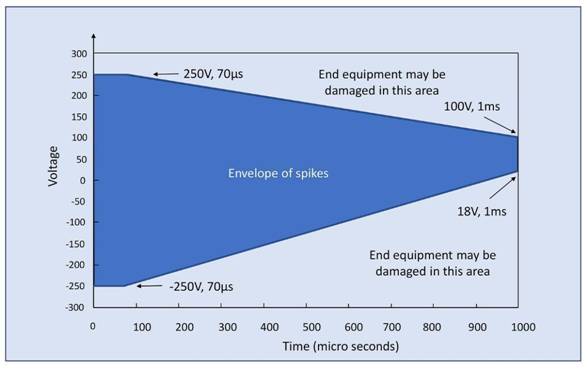 考慮到 MIL-STD 1275/F,要求設備能夠抵抗短尖峰,峰值高達 +/-250V,持續 70μs 最大值,在 1ms 內線性減小到 +100V 和 +18V 之間的值。任何單個尖峰的最大能量為 200mJ (圖3)。
