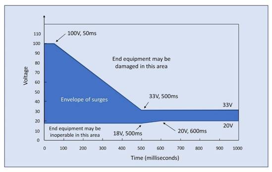 也可能存在高能量浪涌 降至 +100V 持續 50ms,線性降至 >33V 持續 500ms,而降至 18V 可持續 500ms,降至 <20V 持續 600ms(圖4)。