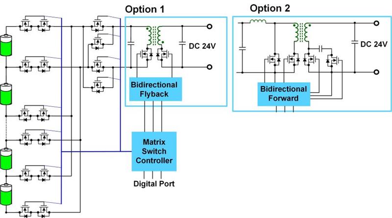 雙向反激式轉換器或正向式轉換器的初級側連接到電池組或輔助電源軌。在這種布置中,每個電池都可以與電池組或輔助電源軌交換能量(充電或放電期間)。如上所述,開關矩陣加變壓器的主要優勢在于只需要一個變壓器。