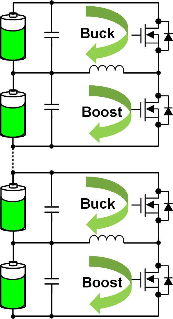 降壓-升壓主動平衡器采用更簡單的方法,利用常用的降壓和升壓電池充電器技術。降壓-升壓主動平衡不是將電荷移動到電池組的各個位置或單獨的電源軌,而是將電荷移動到直接相鄰的電池。這大大簡化了平衡電路,并利用多個平衡器的同時操作將電荷分配到整個電池組中。
