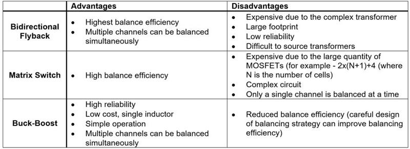 在三種類型的主動平衡器中,雙向降壓-升壓主動平衡器簡單、可靠。表 1比較了這三種主動平衡方法。