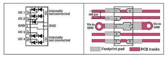 用于高速的 ESD 保護設備使用流通式封裝,以方便正確的布局實踐。圖 2 顯示了 ST 的HSP061-4NY8的引腳排列,它為 HDMI、USB 3 和類似接口提供 4 線 ESD 保護。I/O 電容接地為 0.6pF,差分阻抗在 HDMI 規(guī)范下為 100 Ω(典型值)。