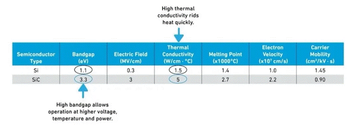• SiC擊穿電壓更高,這意味著可以更輕薄的器件來支持更高的電壓。