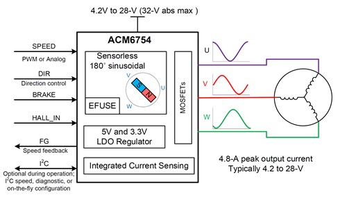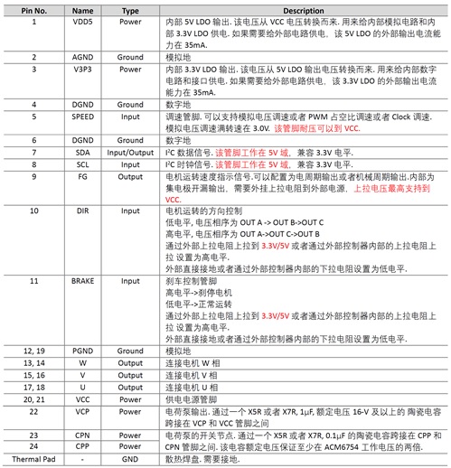 ACM6754是一款三相無刷直流電機驅動芯片,內部集成無感三相無刷電機驅動算法、相電流檢測電流電路、柵極驅動電路以及功率MOS管. 支持最大4.8A的相電流. ACM6754的高集成度以及精簡外圍特別適用于高功率密度、小尺寸、靜音要求高的三相無刷電機驅動器