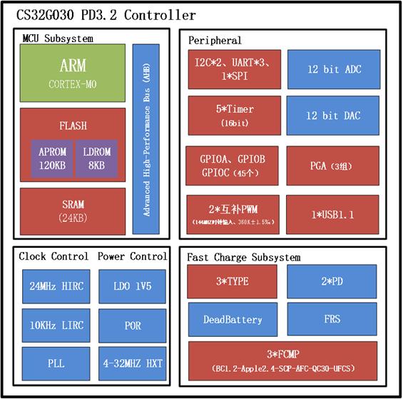 下圖為CS32G030的資源框圖,其中紅色模塊表示相較于CS32G020升級或增加的模塊。