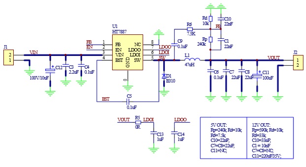 開關頻率可高達1MHz,從而允許小尺寸的外圍器件。過熱保護和短路保護(SCP)使芯片具有較好的可靠性和容錯機制。200µA的靜態電流允許HT7887用于電池供電的應用中。