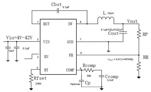 HTN7743是3.5A降壓轉換器,具有從4V到42V的寬輸入電壓,集成了90mΩ高側MOSFET和60mΩ低端MOSFET。HTN7743采用峰值電流模式控制,支持跳周期調制(PSM), 有助于轉換器在輕負載下實現高效率。
