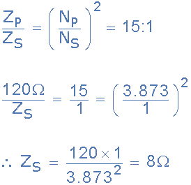 需要使用阻抗比為 15:1 的音頻變壓器來匹配功率放大器的輸出和揚聲器。如果放大器的輸出阻抗為 120Ω。計算功率傳輸所需的揚聲器的標稱阻抗。