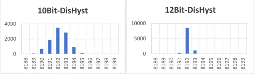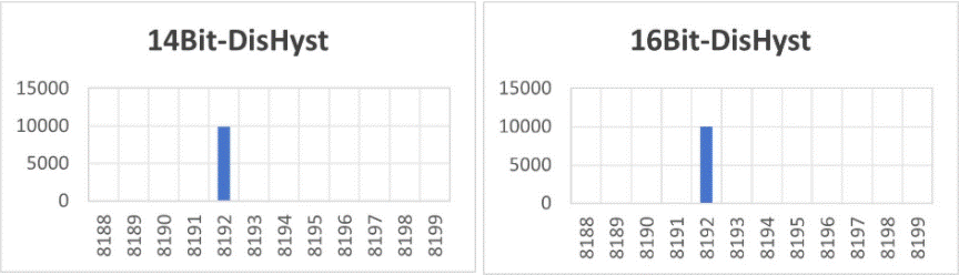 3、 角度精度碼分布集中,噪聲表現(xiàn)良好(10000次測量,數(shù)據(jù)分布,數(shù)據(jù)長度均為16bit,圖上標(biāo)的bit數(shù)均對應(yīng)性能,相當(dāng)于enob)