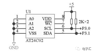 電路連接如圖5,其中A0,A1,A2為地址線,本例中全部接地,因此全部為0。由于SCL和SDA為漏極開路輸出,所以在使用時,需加上拉電阻。