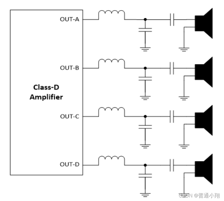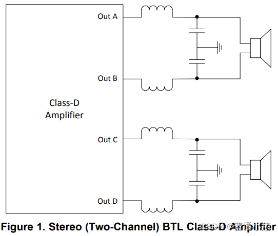 橋接負(fù)載(Bridge-tied load, BTL)是D類放大器最常見的輸出配置。BTL配置由一個放大器驅(qū)動負(fù)載的一側(cè)OutA ,另一個放大器從第一個放大器得到反向信號OutB,驅(qū)動負(fù)載的另一側(cè)。相比于單端(SE)電壓相當(dāng)于翻倍,功率P = V*V/R,所以功率最大可以做到相當(dāng)于單端的4倍。