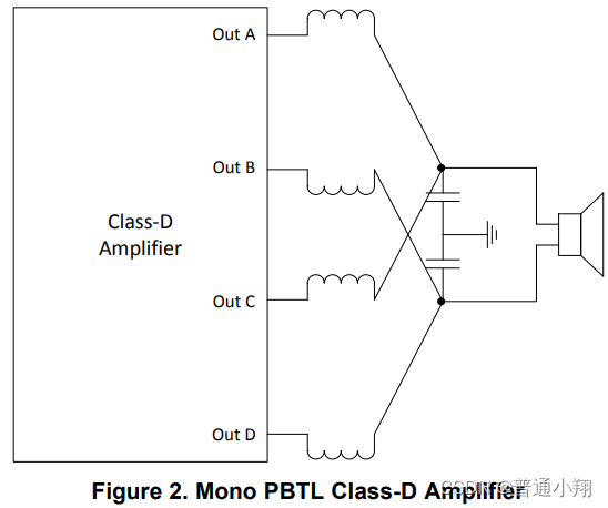 并聯(lián)橋接負(fù)載(PBTL)是一種輸出配置,它采用立體聲BTL放大器,并將輸出并聯(lián)為單聲道。PBTL和BTL的負(fù)載兩端電壓相同,但由于每個輸出負(fù)載電流翻倍,因此最大電流已經(jīng)增加。由P = UI 得,PBTL功率為BTL的2倍。
