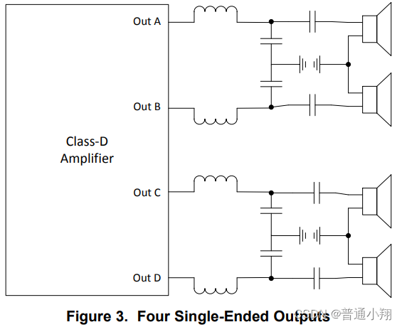 單端(SE)配置中,只使用一個輸出來驅(qū)動負(fù)載,而不是像BTL和PBTL配置中那樣使用一對相位不同的輸出。但是,這種配置可以使用單個立體聲BTL放大器實(shí)現(xiàn),如下圖所示。一些放大器還允許組合1× BTL和2× SE通道,以支持單個設(shè)備的2.1音頻系統(tǒng)。