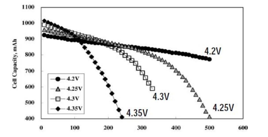 一、 如下圖為鋰離子電池的容量、循環壽命和充電電壓之間的關系,縱軸為電池容量,橫軸為循環壽命次數,可以看出充電截止電壓越高,循環壽命更短,容量下降也更快