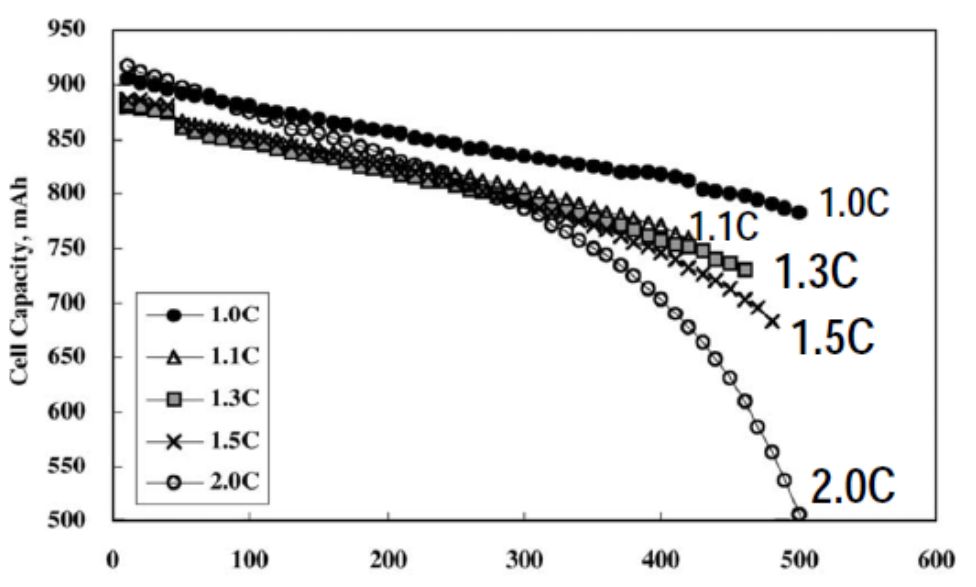 二、 如下圖為鋰離子電池的容量、循環壽命和放電電流之間的關系,縱軸為電池容量,橫軸為循環壽命次數,可以看出對于充電速率越大,容量衰減速度越快