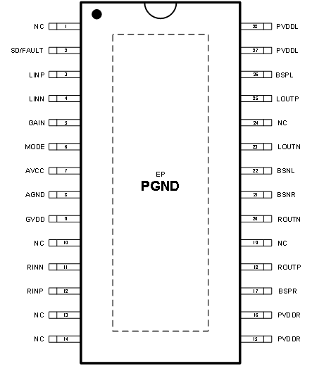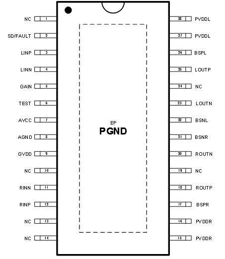 2×50W (VDD=24V, RL=6Ω, THD+N=10%);